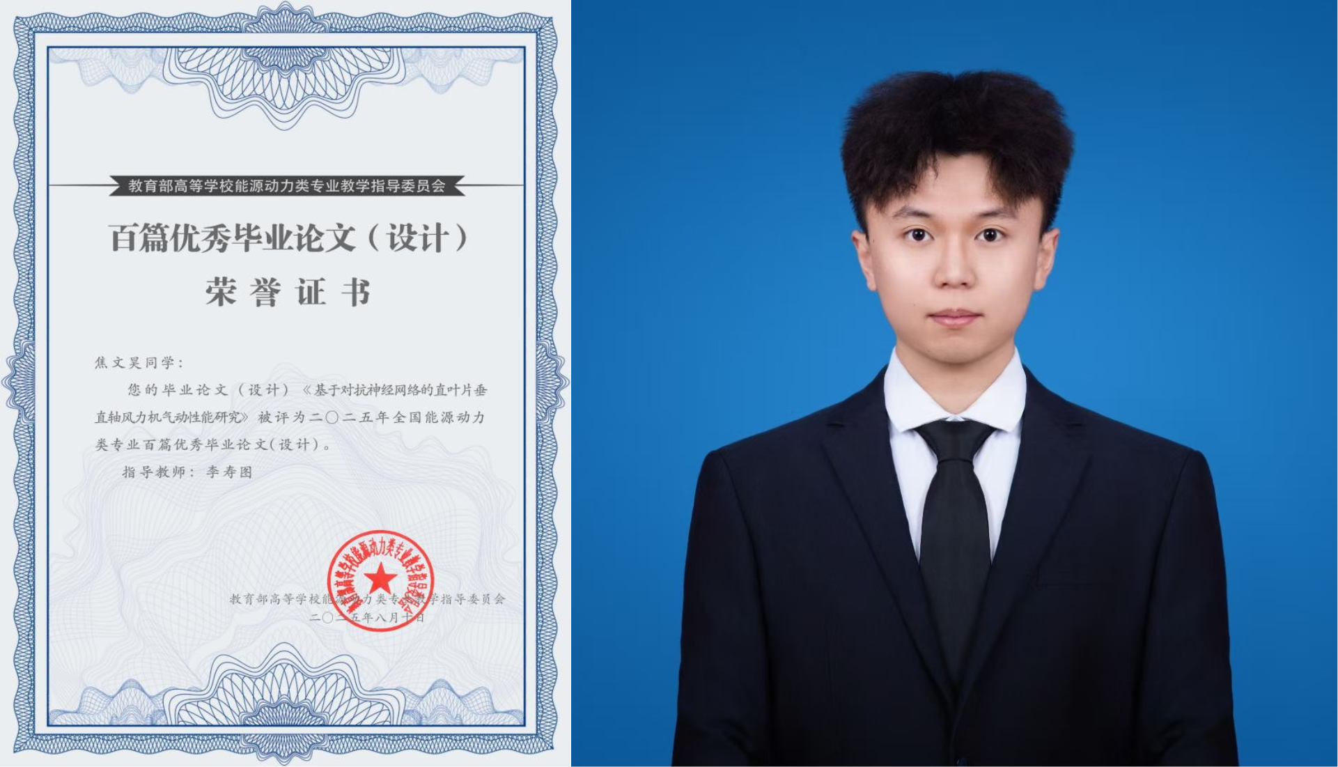 焦文昊的毕业论文(设计)《基于对抗神经网络的直叶片垂直轴风力机气动性能研究》荣获校毕业设计一等奖,推荐参加教育部高等公司能源动力类专业优秀毕业论文评选,评审专家评价:该文章利用深度学习技术建立对抗神经网络的模型,通过双致动盘多流管模型计算出最优翼型,完成从气动外形优化到风力机整体设计的全过程;论文工作饱满,员工还有代表性专利和论文;写作规范,结构清晰,模型结果合理,展示出良好的科研素养。