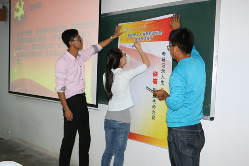 大会伊始,由第一党支部组织委员柳国琦对此次有关“诚信考试、踏实做人”为主题的大会作简要阐述,指出此次大会的意义和目的。之后,宣传委员全敏宣读了《诚信考试倡议书》。组织委员史存军领读,其与党员以“诚信考试”为主题进行诚信宣誓,从自身做起,组织党员进行了诚信考试签名。