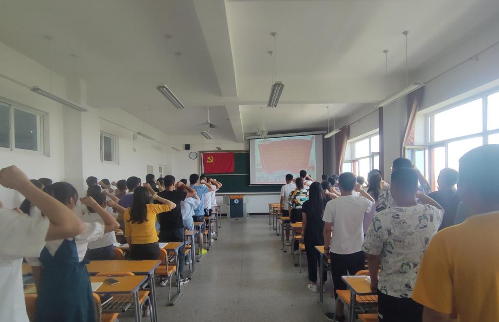 牛磊副书记将党史学习与党性教育相结合,鼓励毕业生党员学史明理、学史增信,学史崇德、学史力行,党性教育入脑入心,要守初心担使命,忠于党的事业,勇于开拓创新。同时向毕业生党员讲述了党员关系转接流程和注意事项。结合党章为即将参加工作的毕业生党员讲解了党员的义务和权力。表达了对毕业生的美好祝愿,预祝大家在新的阶段取得更好的成绩,并对毕业生党员提出四点要求:一是要把加强党性教育作为毕生的追求去努力,促使自身信仰更加坚定,党性更加纯粹,成为祖国和革命事业的栋梁之才。二是积极参加党内生活,提高党性修养。作为党员,要行为端正,严于律己,不断用行动锤炼自己的党性;培养和树立良好的政治品格,做一个有担当的人。三是树立党员形象,争当先锋表率。做到吃苦在前、不怕困难,敢于为集体的荣誉牺牲奉献。四是要严守党规党纪,从内心深处守住底线,筑牢防线,不越红线。随后组织全体毕业生党员重温了入党誓词。