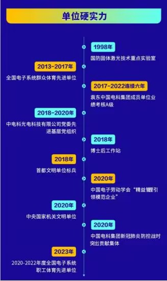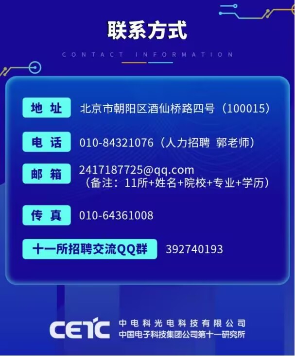 中国电子科技集团公司第十一研究所(华北光电技术研究所)始建于1956年,隶属于中国电子科技集团公司,是研究激光与红外技术的综合性研究所,国家一类科研事业单位。研究领域主要科研领域为固体激光与红外,包含机加工、光学元件加工。与镀膜、红外和激光材料、器件、仪器、设备。与系统,是我国主要的光电技术研究所之一。机构实力全所共有实验室及车间42,000平方米,生产基地200亩,在职职工近1000人。其中工程技术人员600余人,具有高级技术职称以上人员160余人,中国工程院院士1名。我国政府已连续投资改造材料与器件研究室,建立了具有先进水平的可批量生产材料与器件生产线,设立了国家固体激光工程技术中心。为了加速科研成果产业化,所内成立了几家有限责任公司。2000年以来不断进行机构、分配、聘用制度改革,科研任务及经费充足,为青年人成才创造了良好的机会。