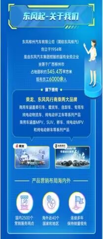 东风柳州汽车有限公司(简称东风柳汽)创立于1954年,是由东风汽车集团股份有限公司持股75%、广西柳州市产业投资发展集团有限公司持股25%的国有全资控股公司,公司占地面积约5180亩(345.4万平方米),现有员工5700余人,是东风公司在南方的商用车生产基地、乘用车生产基地、自主品牌研发基地和东南亚出口基地。公司旗下拥有乘龙、东风风行商乘两大品牌;商用车涵盖牵引车、载货车、自卸车、专用车、纯电动物流车、纯电动环卫车等系列产品,乘用车涵盖MPV、SUV、轿车、纯电动MPV和纯电动轿车等系列产品。