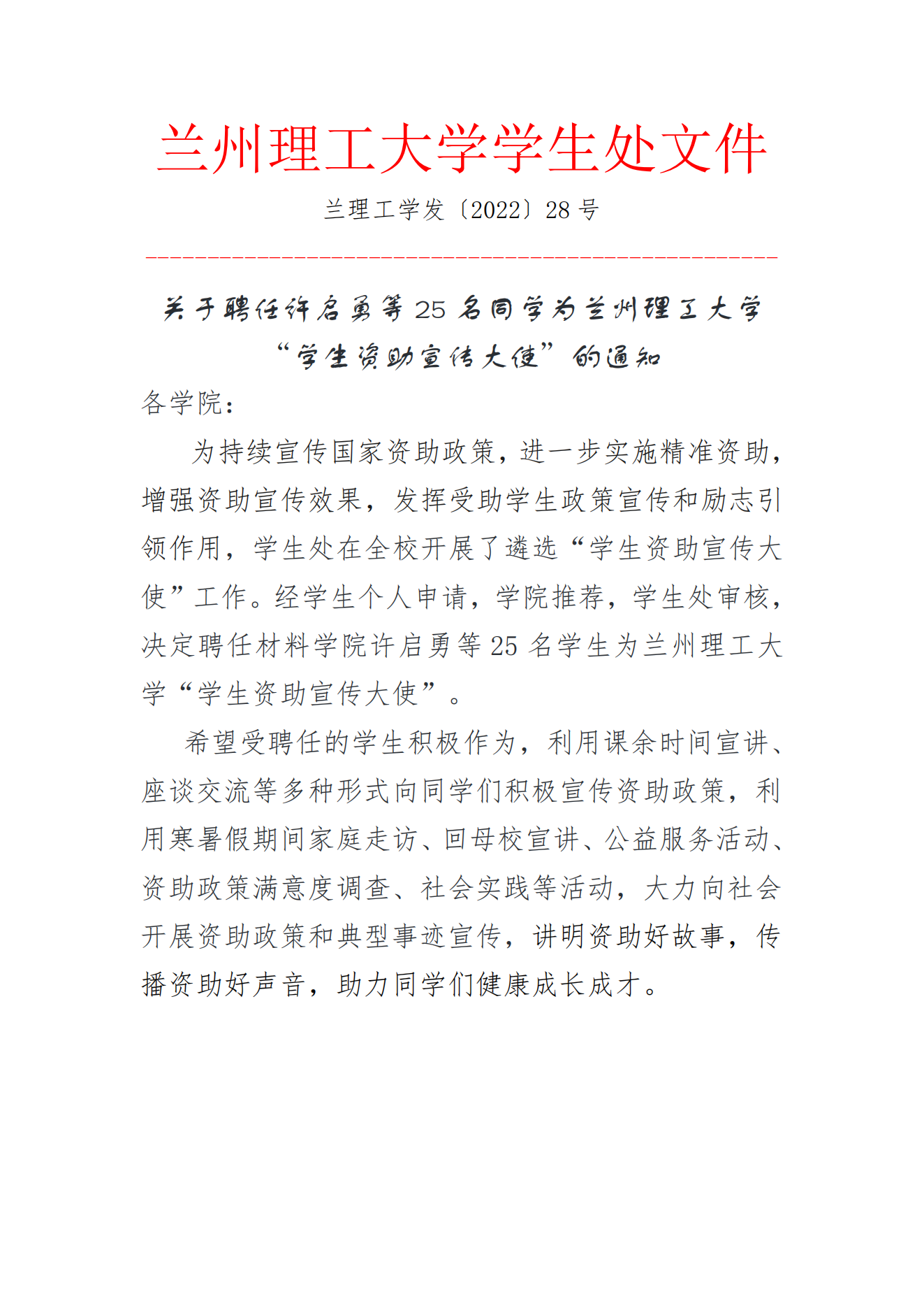关于聘任许启勇等25名同学为suncitygroup太阳集团官方网站“员工资助宣传大使”的通知